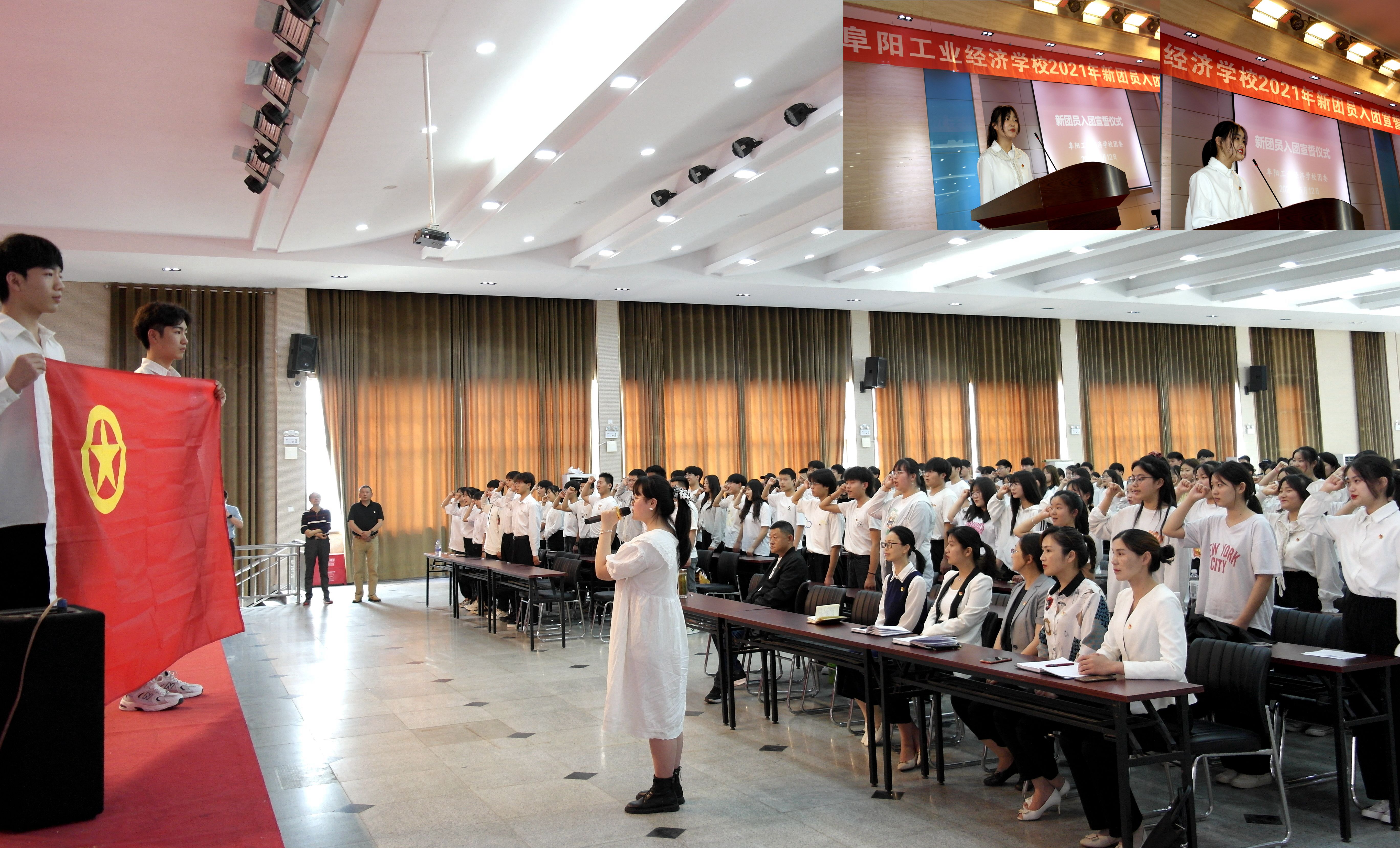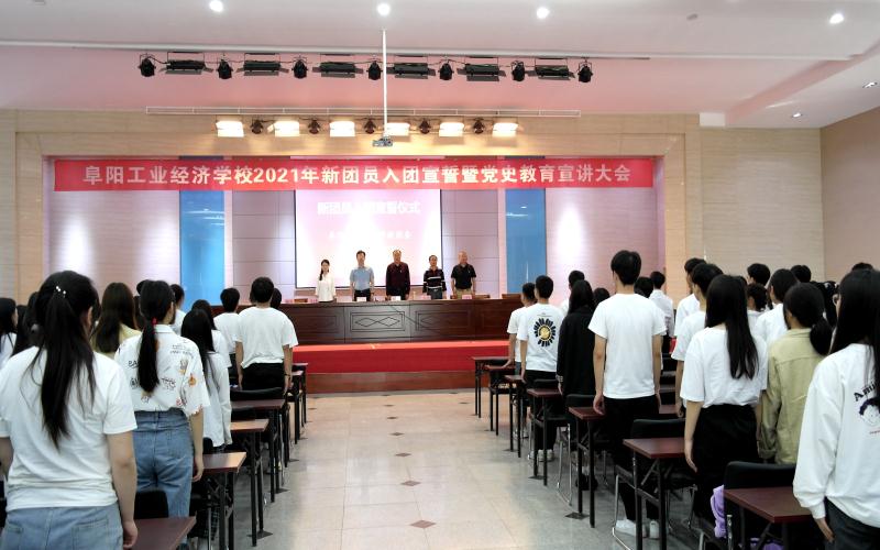 5月12日,“传承红色基因 勇担时代使命”2021年阜阳工业经济学校新团员集中入团宣誓仪式暨学党史教育宣讲大会在多功能厅举行。共青团阜阳市委副书记许灿,阜阳工业经济学校副校长范峰、相关科室负责人、学生党支部党员、校团委委员及教师和团员代表三百余人参加了活动。