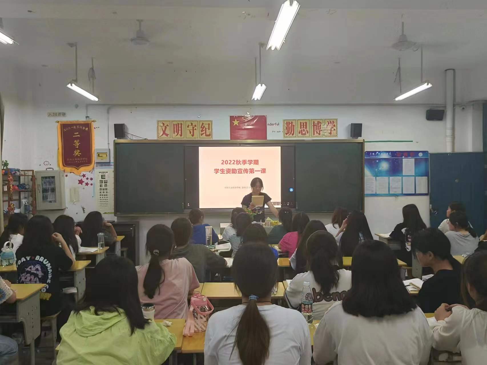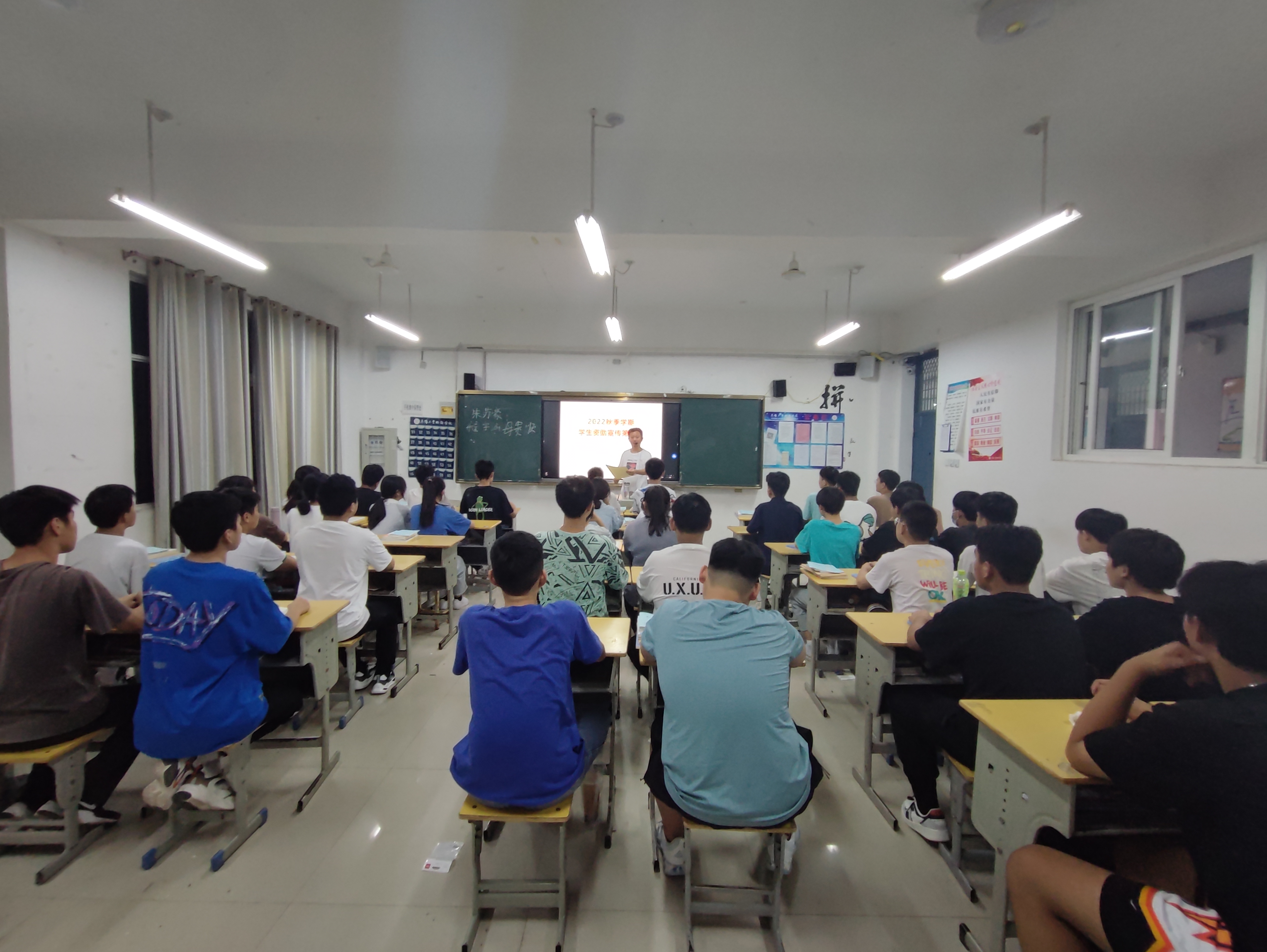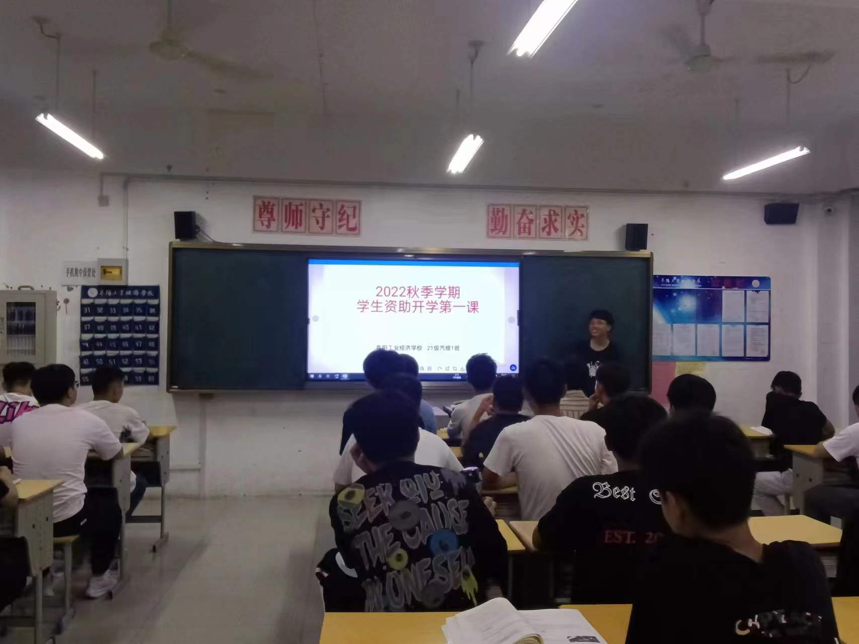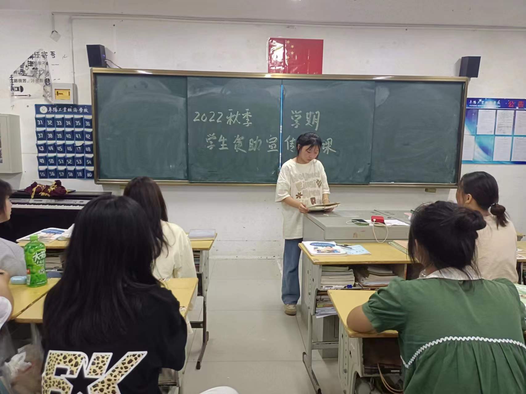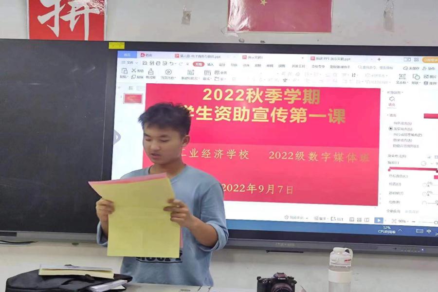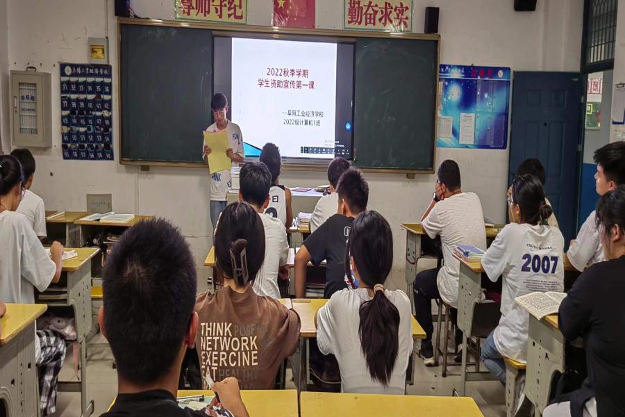 阜阳工业经济学校2022年秋季新学期各班级利用晚自习时间开展了学生资助政策宣传第一课主题班会活动。