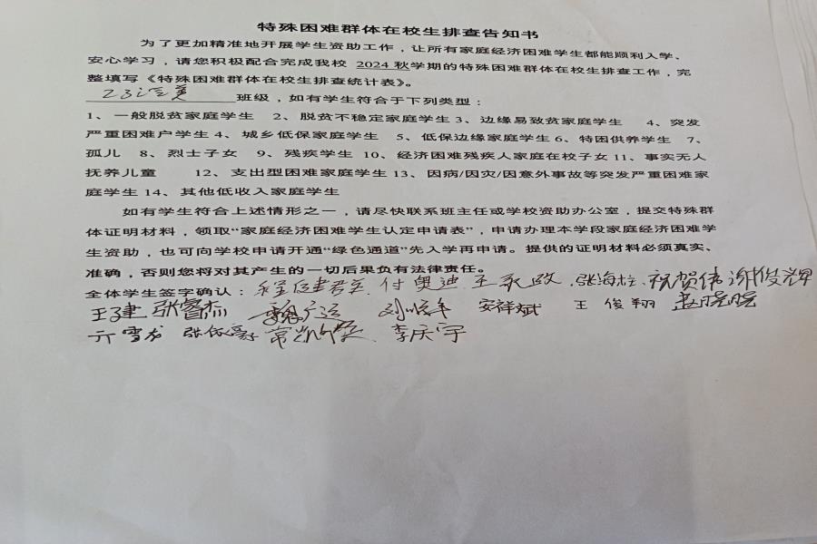 阜阳工业经济学校特殊困难群体在校生排查告知书