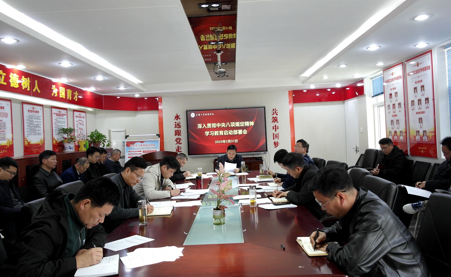 3月31日,阜阳工业经济学校召开深入贯彻中央八项规定精神学习教育启动部署会暨党委理论学习中心组学习扩大会。会议学习了习近平总书记关于学习贯彻中央八项规定精神的重要指示和加强党的作风建设的重要论述,传达学习了党中央及省委、市委开展深入贯彻中央八项规定精神学习教育有关会议、文件精神,并对全校学习教育安排部署。校党委书记周波主持会议,校班子成员、各科处室负责人参加会议。