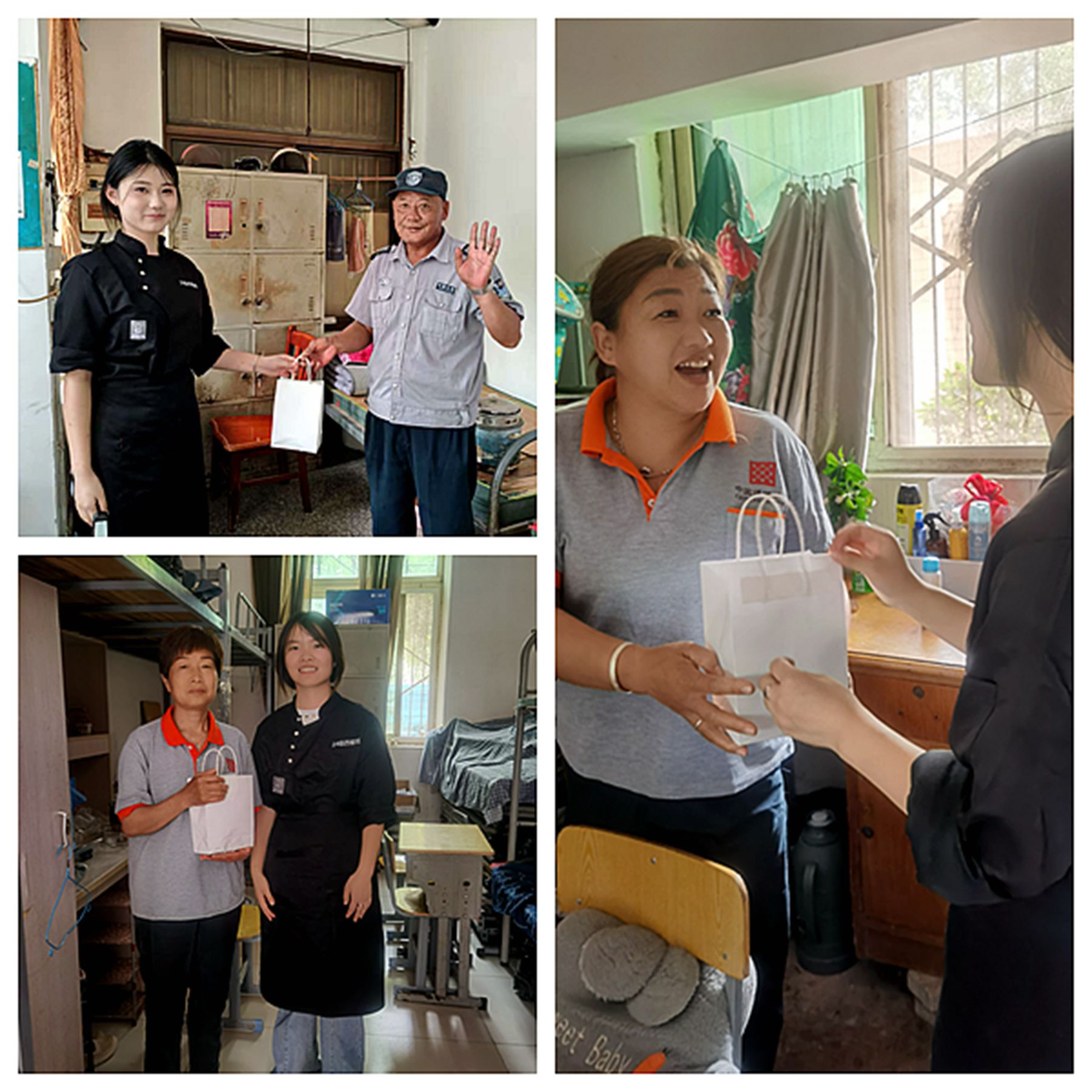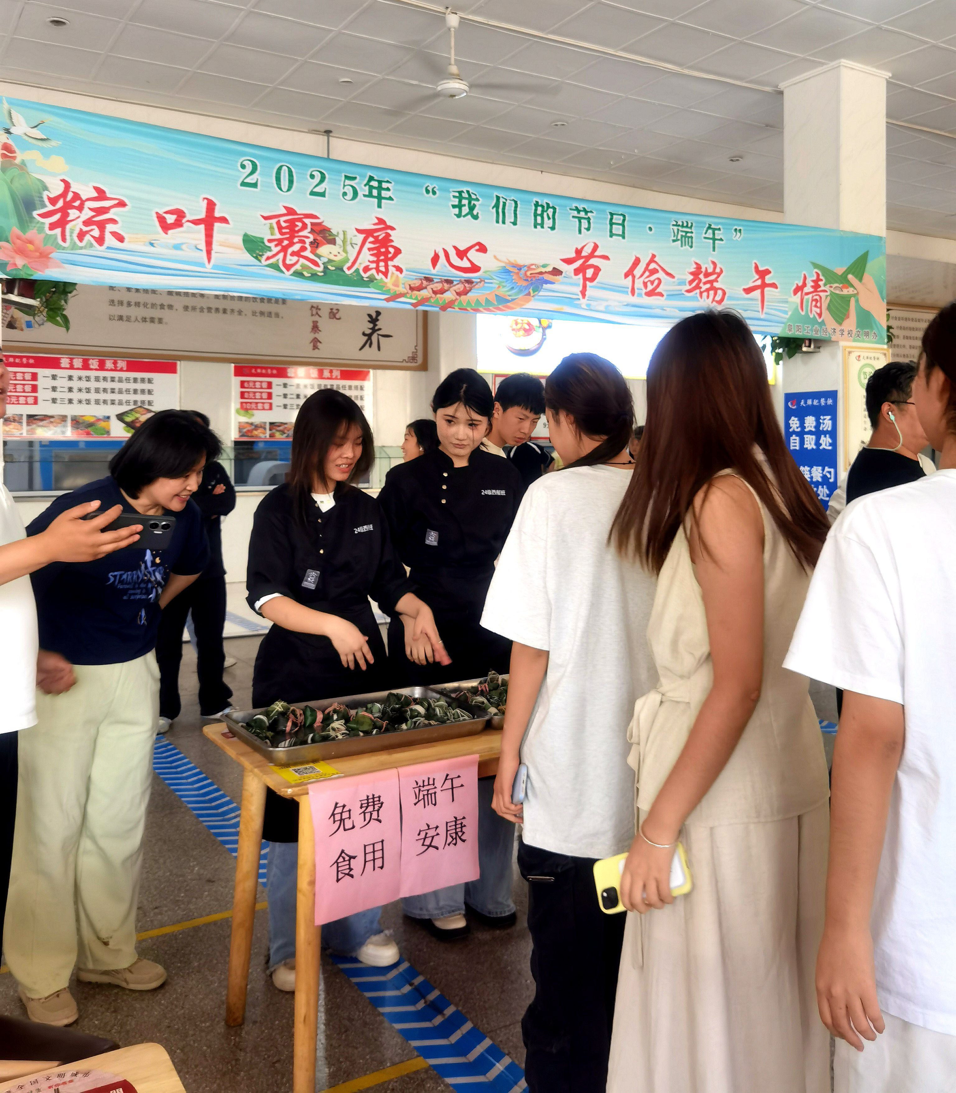 活动结束后,学生代表将包好的粽子分发给宿管阿姨、门岗大叔及食堂就餐学生。一份份承载着端午祝福的粽子,不仅让后勤工作人员感受到节日温暖,更让学生在劳动实践中体会到 “崇德向善、奉献他人” 的价值观内涵。